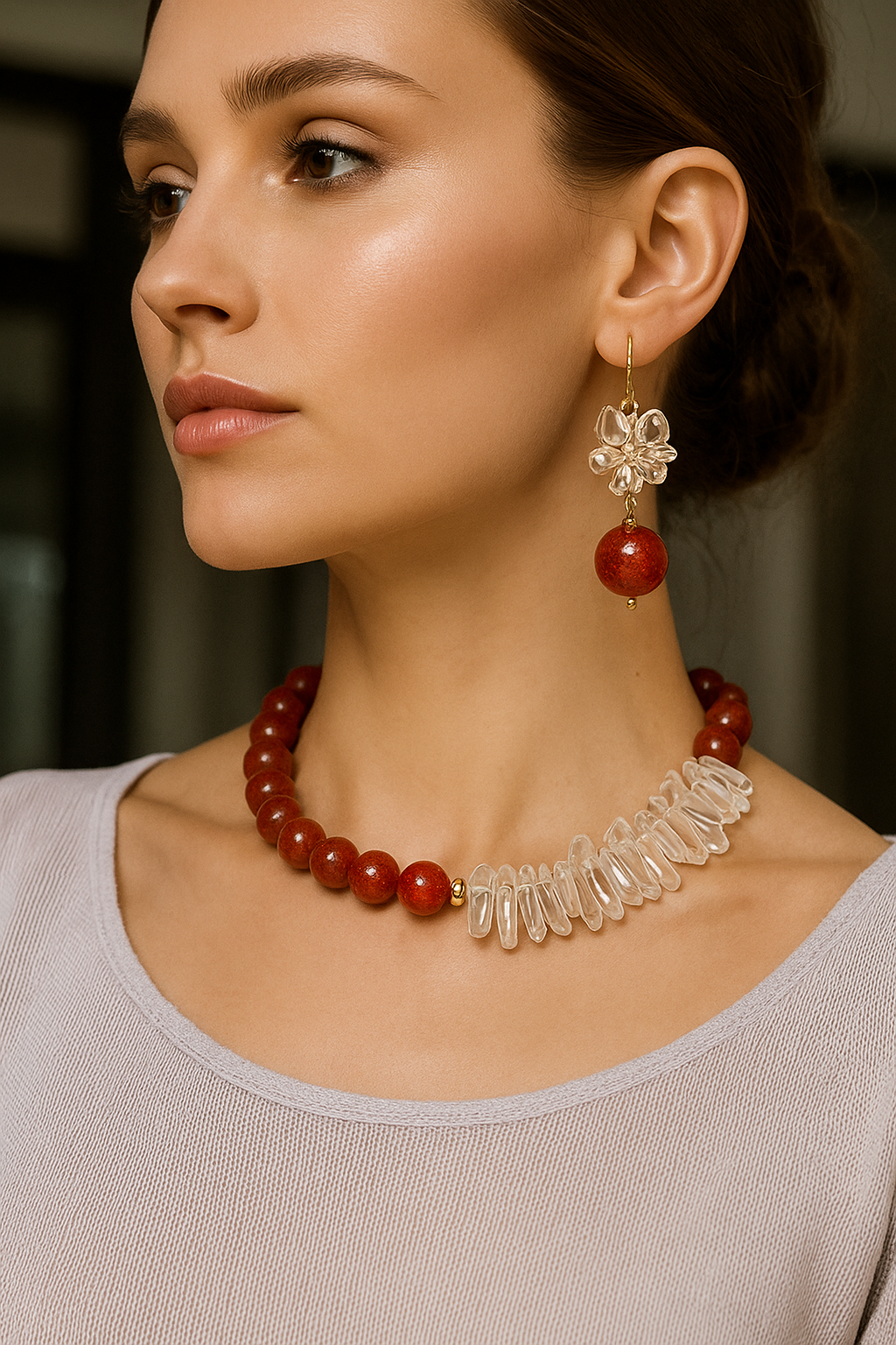La rica ágata roja irradia coraje y vitalidad, mientras que el cuarzo cristal amplifica la claridad y la intención. En el centro, una luminosa cuenta difusora de vidrio rojo, como una brasa capturada del ardiente horizonte del desierto, lista para contener la fragancia que impulsa tu transformación.