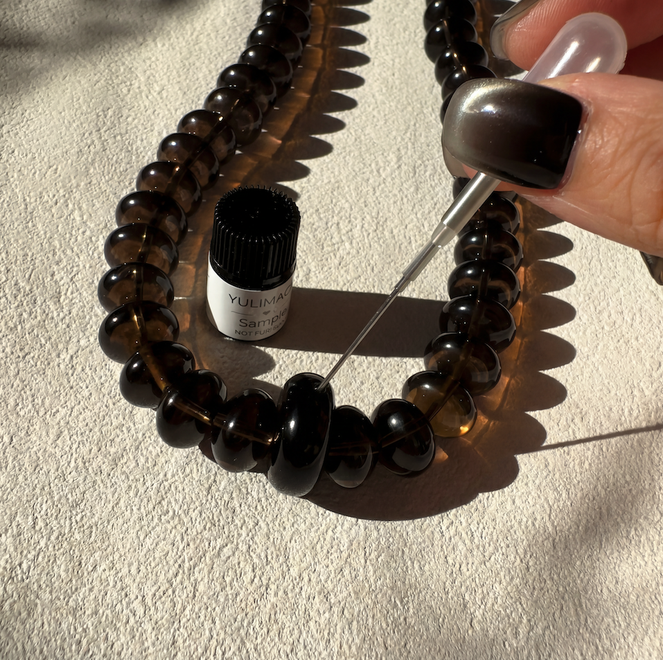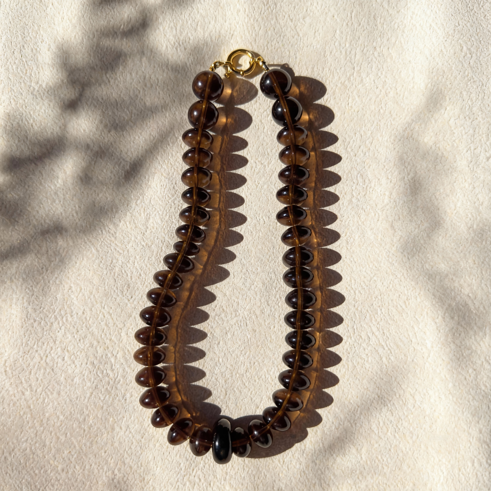 The distinctive orbit-cut smoky quartz beads form a smooth, modern orbit around the neckline. At the center, a deep-toned hand-blown aroma glass bead anchors the design — a refined focal point and a personal vessel for scent, carried close to your skin.