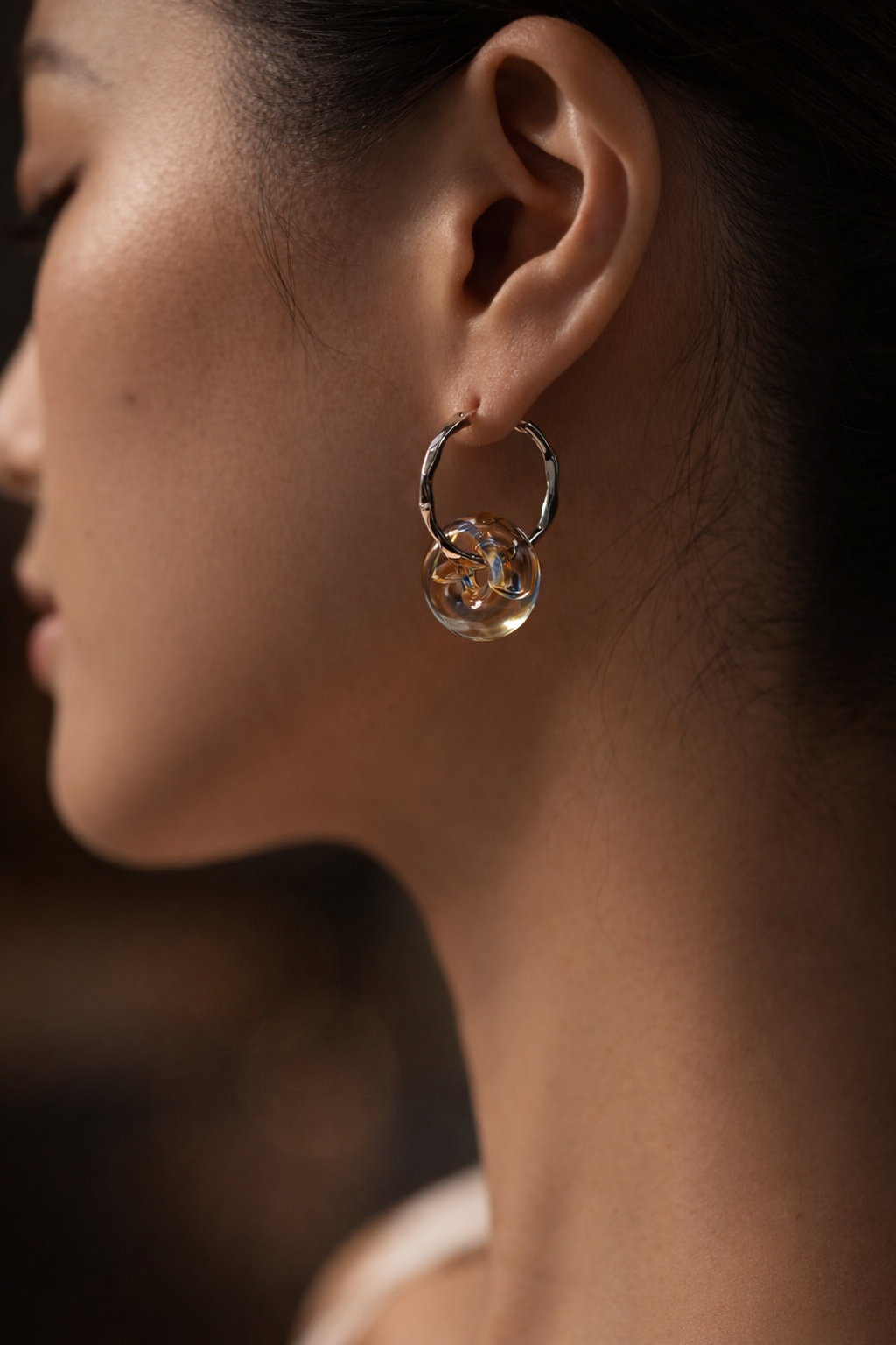 一枚雕塑感銀耳環,表面帶有流動般的紋理,在光線中輕柔反射。耳環採用 S925純銀鍍白金工藝打造,中央懸掛一顆可更換的玻璃香珠,用於承載你選擇的精油氣息。